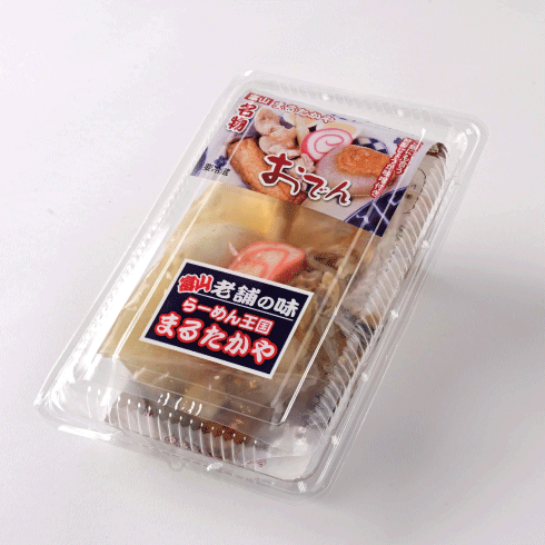 【おでん】 牛すじ、 大根、玉子、ごぼ天、 赤かま、 すすたけ、こんにゃく、醤油(国内製造)、昆布、煮干、鰹節、鯖節、食塩、砂糖、酒、みりん、唐辛子/調味料(アミノ酸等)、酸味料、ビタミンB1、 甘味料(ステビア) 加工澱粉、保存料(ソルビン酸)、着色料(赤3 アナトー)